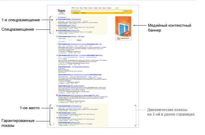 При показе объявлений на Рекламных местах, указанных в п. 2.1, 2.4. Правил, объявления не попавшие в Спецразмещение и Гарантированные показы попадают в Динамические показы.