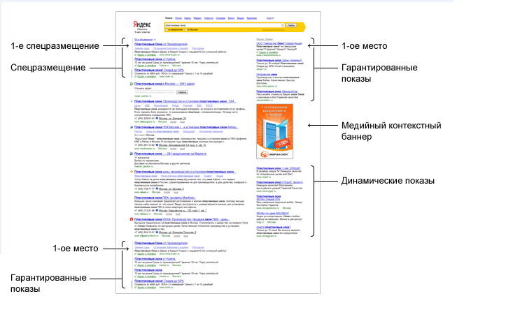 При показе объявлений на Рекламных местах, указанных в п. 2.1 Правил, объявления с наилучшими показателями попадают в Спецразмещение и в Гарантированные показы. Если показы объявлений осуществляются справа от результатов поиска, то остальные объявления (не попавшие в Спецразмещение и Гарантированные показы) попадают в Динамические показы. Если показы объявлений осуществляются под результатами поиска (для Рекламных мест, указанных в п. 2.1 Правил), то показ объявлений, не попавших в Спецразмещение и Гарантированные показы, не осуществляется.