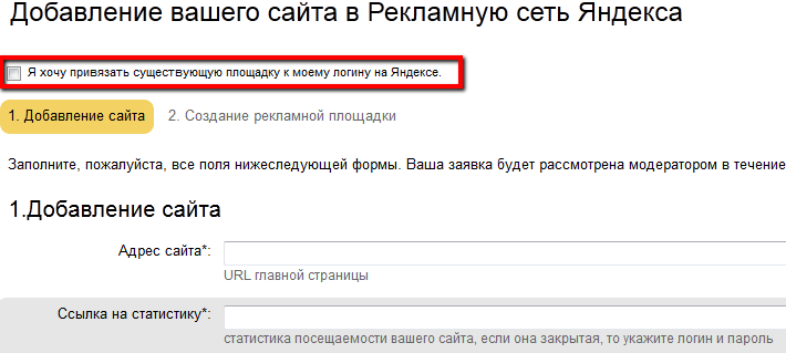 2. Добавить площадку (http://partner.yandex.ru/registered/?cmd=campaign_add). При добавлении нужно отметить пункт «Я хочу привязать существующую площадку к моему логину на Яндексе». Ввести домен и id площадки.