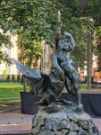 Окна наших апартаментов выходили на этот сквер и на театр Янки Купалы. Часто слышалось пение птиц, и это в самом центре города. Очень красивый скверик у театра и у здании администрации президента. Старые мощные деревья, прекрасный фонтан со скульптурой мальчика с гусем. Много скамеек, есть кафе.