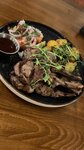 Проходили мимо вечером с коллегой и зацепил запах еды, разносящийся ветром в сотни метров от заведения. Сразу захотелось поесть вкусного мяса и заведение, показавшееся на горизонте, не заставило себя долго ждать в угоде нашим голодным животам. Стол свободный нашли, проводили , выдали меню , от которого глаза в разбег пошли и еще больше захотелось есть. Брала салат : алазанский вроде - очень вкусный, сытный . На второе - люля кебаб . Подруга тоже ела салат с ореховой заправкой , хинкали и баклажан под сулугуни. Запивали мы игристым , и только к нему остались вопросики. Назвалось оно просекко, но по составу было совсем не из «Глеры», а очень даже хуже, фото прилагаю. Но давайте про еду: в моем салате очень вкусная заправка и большой кусок красной рыбки - по моим меркам вышло совсем не дорого. К кебабу попросила дополнительно нож, но могла б и без него съесть - мягкий , вкусный . Попросила передать пожелания по соусу , официант объяснила, что можно из заменить - приятно . За лояльность плюсик . Обслуживание не быстрое, но очень внимательное. Антураж заведения шикарен. Грузинская музыка добавляет вайба . Рейтинг полностью оправдан Нахожусь в командировке три дня, но , думаю, еще вернусь сюда - хочется еще новые блюда попробовать