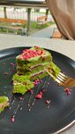 Искал новых впечатлений, нашел кафе, которое чуть больше чем кафе. Это целое пространство созданное у входа со стороны ул. Ленина. Скамейки, столики, качели в тени романтичных каштанов. Веранда на месте лестничной площадки не только расширяет пространство, но и создает гармоничный объем, отделяясь от жилого дома, гле расположено кафе. Отличное место для летнего отдыха, в том числе и с детьми. В ассортименте найдутся напитки на любого желающего, кроме алкогольных. Чай, лимонады, коктейли (в том числе и молочные) и, конечно же, кофе. Пирожные, как мне обещали свежие, предложив выбрать любое. Фисташковое после заморозки всегда суховато, а если еще постоит на витрине пару дней.. я как раз и заказал флэтуайт с фишташковым тортом. И действительно, пирожное было отличным. В меру сладкое, с кислинкой крема и сочное. Подачу можно оценить на фото. Флэтуайт тоже не подвел. Надо сказать что зерно для кофе очень важно. И в этом кафе явно арабика с хорошей темной обжаркой. Барриста внес саою лепту. Напиток получился в меру горьким и с приятным молочным послевкусием. Обязательно наведпюсь чтобы оценить постоянство вкуса и вкус кофе без молока. Отдельно скажу о посуде. Был приятно адивлен шершавыми керамическими чашками и крупной тарелкой на которой можно эксперементировать с подачей. Темный шоколадный цвет посуды перекликается с общим цветовым дизайном кафе. Есть пара небольших минусов. Без осуждения к курящим, но курение, пусть и на улице это минус. Второй мелкий аспект это столовые приборы. Если их после мойки плохо протереть, то остаются разводы капель. Такие я обнаружил на ножике. Конечно, большинство этого не заметит, но нет пределов совершенства. В общем рекомендую включить это кафе в свой маршрут всем, любителям кофе)