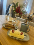 Заходили утром в выходной. В зале было пусто. На входе на поприветствововали, предложили помощь с выбором. Заказывали эклер "Назад в СССР", кофейный с грушей, чизкейк и зелёный чай. Десерты все понравились, каждый хорош по-своему. Вкус неприторный, начинки много. Цена, конечно, соответвующая. Заведение видно, что уже не новое. Пора сделать ремонт, в т.ч. в туалете, обновить затёртую посуду. Музыкальный репертуар в виде американского рэпа странный. Не очень стыкуется это всё с приятным времяпрепровождением. Общий чек получился на 48 BYN.