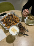 была в заведении вечером, когда пришла, изначально мест практически не было, очень популярное место в фаниполе. заказала крем суп из шампиньонов с сыров, так как других в наличии не было. суп очень вкусный, сыр хороший, не пластилиновый) также заказала куриную грудку с овощами в винном соусе, тут уже грустнее стало, сама курица очень вкусная, а вот овощи то ли недотушенные, то ли недопеченные, морковь и брокколи были твёрдыми достаточно. очень долго ждала счет, пришлось даже обратить на себя внимание. туалет заведения оказался общим туалетом бизнес центра, к тому же достаточно грязным.