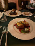 Обзор исключительно на террасу кафе Пушкинъ 😎 Попасть туда по брони невозможно, только по факту, но и факту оказалось, что очаровательные хостес живут ещё представлениями фейсконтроля 00х и грустно сообщили что вся терраса забита. Как хорошо, что появились искренние зумеры - официант, молодой человек, подошёл и сообщил, что на террасе есть столик и проводил нас к 200летнему лифту на подъем Терраса стоит того, чтобы на ней побывать, небольшая, уютная, абсолютно тихая и спокойная, уставлена цветами и с неё открываются очень затейливые виды на привычную казалось бы Москву Меню действительно впечатляет сочетаниями, названиями и придумками - салат из турецкого плода - салат из цукини с внутренностями окрошки и цветами, очень затейливый, понравился, но слегка островат Бефстроганов настоящий, по рецепту из книги о вкусной и здоровой пище, просто супер круто! Десерт кафе Пушкин - это сплошное роскошество и великолепие, не сладкий, но с множеством переливающихся и смешивающихся вкусов и текстур, восхитительно! Сорбет также достойный похвалы Впечатления приятные, сам ресторан заслуживает внимания точно 💚 П. С. А разве на террасе можно курить? За соседним столиком курили 🥲