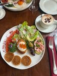 + красивое антуражное место + хороший выбор блюд, свежевыжатых соков штук 10 + красивая подача + грибной эклер просто прелесть + локация - ужасно подпортил впечатление сотрудник гардероба, который дал не ту верхнюю одежду и нас сделал виноватым - оливье совершенно посредственный