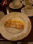Кафе интересно русской кухней и интерьером в стиле старинного особняка. Особенно выделю зал библиотека, где можно посмотреть альбомы с истрией Москвы, увидеть некоторые старинные книги. Здесь можно попробовать вкусные блюда из щуки или телячьих ножек с гречкой, попробовать асторские десерты с красивой подачей. Мой выбор пал на десерт «Кафе Пушкин»- легкий, в меру сладкий.