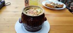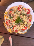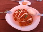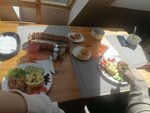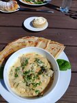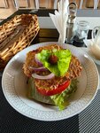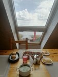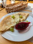Приехали в дождливую погоду, на первом этаже два столика по два человека. Второй этаж был занят под какое-то мероприятие. Всех остальных отправили на открытую террасу. Выдали пледы, это плюс. Еда, хваленая посетителями ранее, не соответствует действительности. Холодник разбавили водой из под крана, потому что была жуткая изжога, драники :один вроде бы свежий, второй пересоленный, вчерашний, разогретый. Такая порция и у меня,и у моей жены. На следующий день обедать сюда не приехали. Рекомендовать не буду, попробуйте сами. Ещё купили выпечку, сказали, что свежая, даже горячая. Оказалось, очень не свежая, просто разогретая в какой-то печке. Большой минус заведению