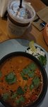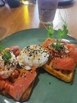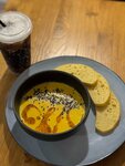Очень вкусный кофе. Брали раф соленная карамель, капучино, флэт-уайт супер! Завтрак яйцо с овощами, том ям и брускетта с красной рыбой (много творожного сыра и рыбы, объедение), еще брала клубничный чизкейк. Все очень вкусно. Приятные девочки, красивый интерьер. Немного испортил впечатление скол на одной из тарелок 😬