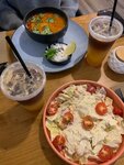 Зашли с мамой перекусить, в итоге все были в телефонах , посуда не очень ,вся пошкрябаная , чизкейк чай матча с привкусом тухлятины , взяли с мамой боул с курицей и с креветками, в итоге рис водяной, холодный, недоваренный , в туалете грязно , навалена гора грязной бумаги . интерьер на двоечку . БОЛЬШЕ НЕ ВЕРНЁМСЯ!!!