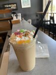 Кафе небольшое, но компанией посидеть не проблема. Есть настольные игры и пледы, которые можно взять с собой на террасу, если стало прохладно. Читала, что не хватает стульев на террасе, а мне кажется, что расставлено все так, чтобы люди не сидели дргу на друге. Кроме кофе, много других напитков. Разные виды горячего чая, есть и айс ти. Милкшейки, сезонные лимонады. Правда много видов кофе. Помимо классических, есть и фирменные, айс кофе, всегда большой выбор сиропов. Меню достаточно большое. Есть полноценные блюда, а также и что-то быстрое, перекусить. Захожу часто и иногда одно и то же блюдо по времени готовится по-разному, но никогда на это не злилась, потому что персонал был вежлив, приносил все в лучшем виде. Вкусно и красиво. Захожу ближе к вечеру и в это время особенная атмосфера. Свет неяркий и мягкий, очень уютно. Обслуживание нормальное, жаль, что нет возможности взять меню на место. Немного расстроена, что из десертов осталась только банановая кесадилия, но по вкусу она мне пришлась, не слишком приторная. Соглашусь, что можно было бы провести комметический ремонт, но и на данный момент все достаточно сносно. В кафе обычно играет веселая, танцевальная музыка, но пару раз заходила и играло что-то более спокойное, зачиталась до самого закрытия. По будням кафе работает до 10, но еще никогда не видела, чтобы персонал кого-то выгонял, я так досиделась до 11 и в это время даже получилось заказать кофе, то есть работают на совесть и на гостей. Ставлю 4.5 из 5
