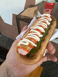 Проезжали мимо, решили заехать в легендарное место ( судя по отзывам) Из плюсов - хорошее и очень быстрое обслуживание, цена. Из минусов - самые обыкновенные и дешевые кетчуп, майонез, горчица . Все таки можно было сделать какой нибудь свой авторский соус. Сосиска в классической лодочке оставляет желать лучшего , при нынешнем выборе сосисок , колбасок и т.д. Да , еще в меню есть блинчики с различными добавками - вот они топ!! Рекомендую. Было бы неплохо поставить несколько низких столиков для посетителей с маленькими детьми.