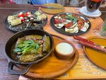 Заведение среднестатистическое. ИЗ ПЛЮСОВ: Красивый и ухоженный интерьер залов. Качественная уборка зала и туалетных комнат. ИЗ МИНУСОВ: Бронирование столиков платное. Не зависимо от того понравилось тебе или нет 10% от счёта отдай. Автоматически в счёте указывают. Еда в целом не плохая, но есть нюанс.. Картинка в меню и картинка готового блюда отличаются не в пользу потребителя. Какие то блюда заведомо были приготовлены на кухне с не любовью и на скорую руку, а какие то по дороге с кухни до посетители потеряли свой вкус и вид. Например, мне не удалось насладиться хинкалями с сыром по причине того что к моменту подачи их на стол они успели остыть.Сыр "застыл одним комком" внутри хинкалины. Вторая хинкалина на мертво прилипла к глиняной тарелке. Оторвала, сок(сыворотка) весь вылился на тарелку. Застывший сыр в обветренном тесте... Ну в общем сами понимаете... Не вкусно. В этом вина официантов и администратора.Очень медленная работа, не организованная... Теперь по кухне:готовят вкусно всю выпечку и мясные блюда, а вот с салатамиии... и так сойдёт. Заявлена кинза, нарубили петрушку.. Заявлен хрустящий баклажан и острая, пряная заправка,а на выходе иное.. Посредственно. Стоит быть профессионалом до конца. Есть на чем работать персоналу. Успехов вам!