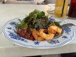 Были с подругами в этом ресторане и впечатление получилось скомканным. Начну с плюсов: 1. Удобное расположение. 2. Красивая и уютная веранда, сам ресторан тоже выглядит красивым и стильным. 3. Понравились коктейли, блюдо с рыбой (мурманская треска) и шоколадный фондан. Минусы: 1. При оплате в чеке увидели пробитые бесплатные хлеб с маслом, которые приносили другим столикам. Очень удивились, увидев это в счете. Мы были расстроены, что нам его не вынесли. Конечно мы не стали ругаться из-за этого, но странно, когда другим посетителям дают комплимент, а нам – нет. 2. Отсюда вытекает проблема обслуживания. Было ощущение, что спустя полчаса обслуживания официант пропал из виду и нам приходилось несколько раз звать другой персонал, чтобы нас обслужили. Создавалось ощущение, что мы навязываемся. 3. Неправильно посчитали настойку и включили в счет наверную сумму. 4. Заказали салат за 1400 рублей — креветки со сладкими помидорами. То, что мне принесли, не соответствует моим ожиданиям и ценнику в 1400 рублей. По итогу принесли четыре креветки, помидоров – ложку с гулькин нос, а большую часть тарелки занимал просто салат с минимальной заправкой. Считаю это обдираловом, не советую этот салат и он не стоит своих денег. Итог: место не самое плохое, мы с подругами хорошо провели время, но на минусы прошу обратить внимание.