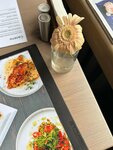 Для меня красота - в деталях. Аккуратно сервированный стол, красивая посуда и приборы, живой цветок в вазочке 🌸Особенно приятна подача горячей воды с лимоном перед едой, мой частый ритуал в обычной жизни. 🥰 Из блюд мне больше понравились бриошь с большим количеством лосося и соуса, руккола дала свою пикантность, авокадо - нежность, и яичко. Все очень гармонично👌 А пышные сырники на манке со сметанкой - ммм, очень по- домашнему вкусно 😋