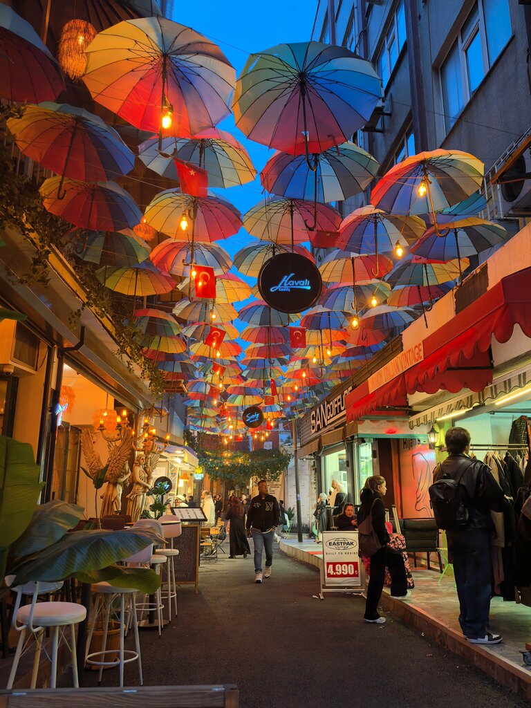 Очень атмосферный квартал Каракёй и зонтики тоже! Особенно, когда смеркается. Рядом много интересных кофеен и клубов, можно найти уголок, где достаточно тихо и приятно посидеть. Здесь на так много людей, как у Галатской башни. Кстати, таких кусочков улиц с зонтиками в квартале Каракёй несколько. Интересно просто обойти этот квартал и насладиться его колоритом.