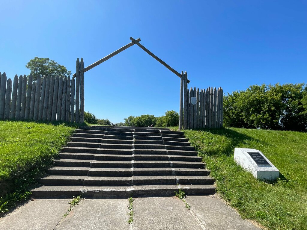 Честно говоря смотреть здесь особо нечего. Стилизованные ворота с частоколом да памятные знаки. Вид на на Днепр возможно был когда-то, но сейчас реку не особенно видно во всей красе.