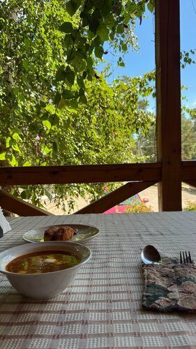 Кафе имеет два уровня. На верхнем - прекрасный вид на море. 🫶 Может в сезон кафе и качает, но в конце октября это не пять звезд. Манты по ощущению подогреты в микроволновке, тесто сухое и твердое. Понравилась баранина и пита с баклажанами и сыром. Пиво закончилось на нас 🙈😁 могли предложить только сок и чай/кофе. По меню хотелось больше аутентичности. В общем, разочаровались, начитавшись отзывов.(