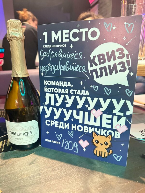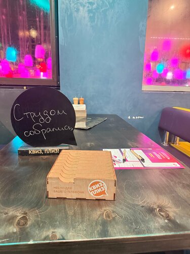 Ходили с коллегами на квест. Забронировали два стола, один стол уже забронировали уже за день до квеста. Места за столами -7 чел разместятся. Очень много желающих, возрастная категория различна. Вопросы тоже разные-не возможно подготовиться, вопросы по географии, истории, музыке -в целом нормально. Мы не подготовленные были. Насчет кафе-дают коктейли, пиво, пиццу. Доставка долгая. Но в целом чисто за столами и в туалете. Кстати, выиграли шампанское, его и выпили все вместе.