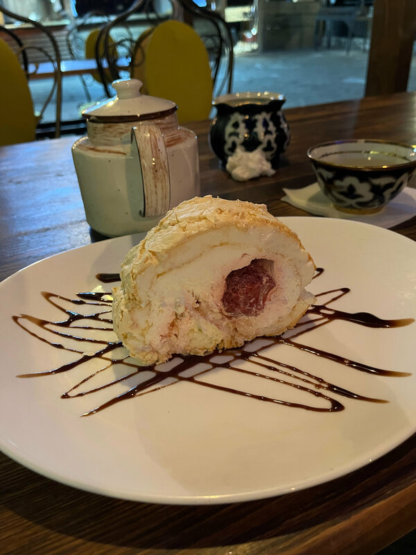 Зашли вечером перекусить в данное заведение. Сидели на летней веранде. Из приятного к нам быстро подошли и принесли меню. Из минусов на вопрос о десертах предложили просто самую дорогую позицию - меренговый рулет. Он у них с консервированной клубникой, не рекомендую, вообще не вкусно, приторно сладко. Жареный сыр с аджикой вкусно. Официант забыл принести приборы. Вынесли блюда, и минут 10 мы ждали вилки. Зато чаевые он себе оставить не забыл. Просто нахальство не додавать сдачу по сумме счета. Мы бы и так оставили принятую сумму «на чай», но с такой подачей выглядит неприятно максимально. Если есть выбор поесть где-то еще, то сюда лучше не идти.