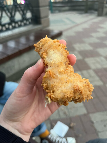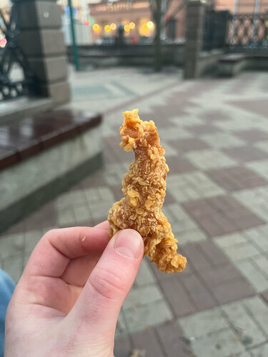Время ожидания в фаст фуде больше 15 минут… (людей почти не было) сделали с подругой заказы. Мне приготовили быстрее, когда сделали заказ подруги, то сказали, что ее стрипсы в моих лежат. В итоге в моих стрипсах были только мои стрипсы. Вернулись забрать, у нас еще заказы проверяли миллион лет, будто мы хотим провернуть аферу века, но в итоге дали стрипсы. Только проблема еще в самих стрипсах, они либо микро крошечные на один зубок и 90% составляет панировка, либо панировки почти нет и мясо очевидно не до конца дожарено. Будет славно заработать еще и сальмоноллиоз!
