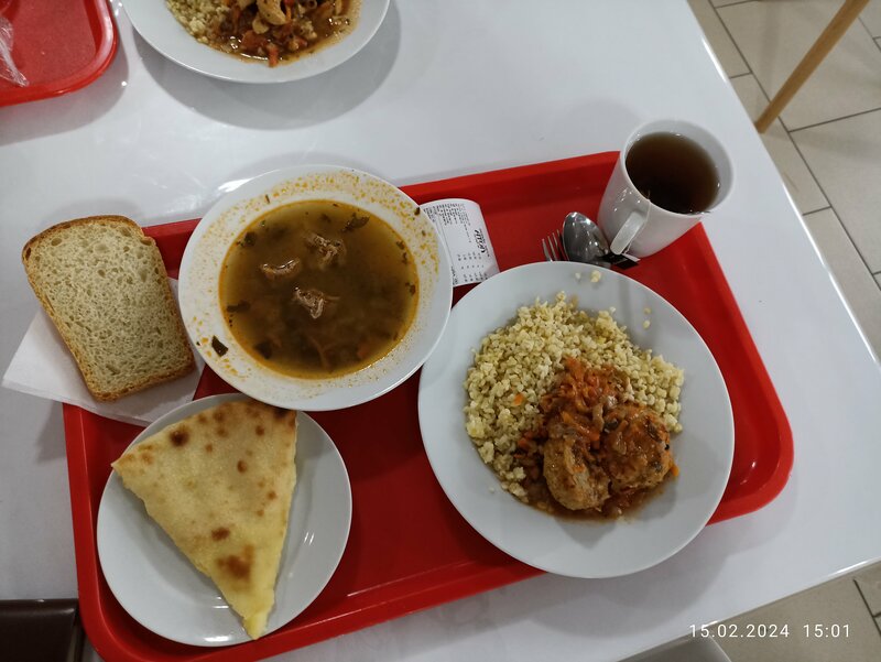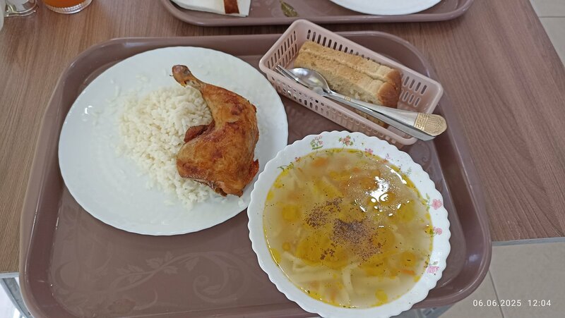 Персонал 4: Поварам 5, раздаче 3. Подогрели плохо, не предложили подливу к рису, не предложили выбрать окорочок, не напомнили про чай/кофе, пытаются обслужить сразу двух, из-за чего возникает путаница. Не стал обращаться, чтобы разогрели немного ещё, опасался, что примут за предвзятое отношение, не хотел лишний раз обращаться. В зале микроволновой печи нет. Но телик большой, прикольный. В зале прохладно. Столы чистые, горчица на столе бесплатная, но закрыта, носик упаковке не срезан. На фото лапша куриная на первое, на второе рис+ куриный окорочок, 2 кусочка хлеба. Без салата, чая/кофе 584 рубля.