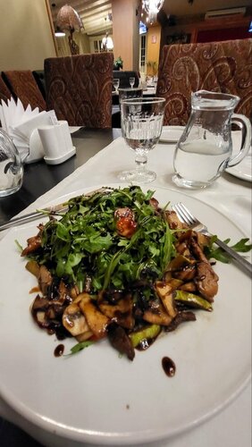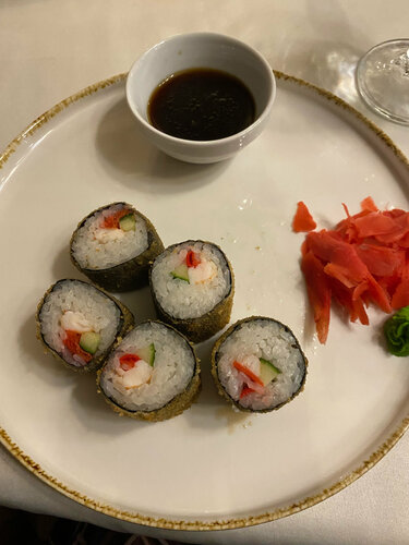 📍Часто проезжаю мимо, когда бываю в Старой Купавне. Этот ресторан посетила впервые 23.02.2026. Столик забронировала заранее на 18.00 На входе никто не встретил , немножко замешкались куда идти )) Подошли к гардеробу и тут подоспели сотрудники, ребята официанты. Предложили занять любой столик. Гостей помимо нас, было немного ( еще за двумя столиками и в углу накрыт стол для банкета). Нас обслуживал Константин. Очень приятный молодой человек. Порадовали большие порции салатов - цезарь с роскошными креветками и теплый с говядиной. А , вот, теплые суши меня лично разочаровали. Крупной нарезки огурец всё испортил , креветки даже не чувствуются ( В 19.00 была заявлена живая музыка . Не то чтобы живая, конечно, на любителя такой формат. Размеры самого помещения и меню впечатляют. Парковка.