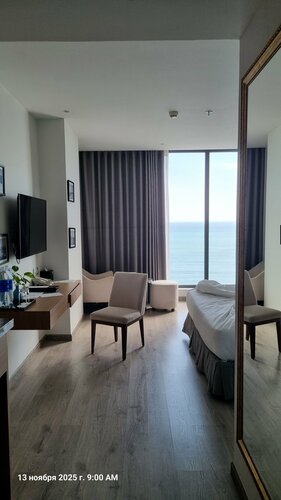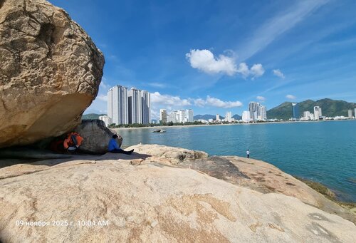 Отельнаходится на 1ой линии, через дорогу от пляжа (рядом находится светофор 😉). Море здесь более спокойное, чем в центральной части Нячанга, но рядом отсутствуют ТЦ и меньше мест для развлечений. Номера просторные, всё что необходимо имеется включая сейф, чайник, холодильник, фен, ТВ (который совсем не смотрели). Огорчило отсутствие балкона и полотенцесушителя (постоянно возникали проблемы с сушкой полотенец и одежды). На верхнем этаже расположен бассейн и сауна, поднимались туда 2 раза и плавали в полном одиночестве. Пляжные полотенца выдают на ресепшене, на пляже (на против отеля) лежаки для постояльцев стоят 50000 донгов соседние по 75000. Завтраки разнообразные, каждый день меняются блюда, фруктов достаточно. Один раз обедали в ресторане порции очень большие (всё съесть не реально), но вкусовые качества блюд так себе, если хотите вкусно поесть нужно ехать в центр Нячанга ( автобус N 23, цена 15000 донгов). Уборка номеров поверхностная, персонал внимательный, готовый оказать любую помощь. У дочери были проблеммы с интернетом в номере, её переселили в другой. Оплату за проживание в отеле можно осуществить картой Union pay (Россельхоз банка комиссия за конвертацию примерно около 5% при стоимости номера за 10 ночей 22000 рублей).
