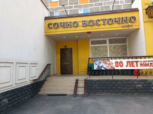Кафе "Сочно Восточно" входная группа без опознавательных знаков (нет таблички с часами работы). Из-за этого создаётся впечатление,что это либо не та дверь, либо кафе закрыто. Внутри чисто, мягкие диванчики. Кто-то из сотрудников видимо очень любит Меладзе, потому что в плейлисте играли только его треки. Туалет общий, как для персонала,так и для гостей. Далее про обслуживание, у нас была довольно таки шустрая и вежливая официантка. Пустые тарелки на столе не застаивались. Но мы были с утра единственными на тот момент посетителями кафе. Меню красочное,не раздутое, что позволяет быстро определиться с выбором.Не во всех позициях описан состав блюда, сами блюда при подачи отличаются от фото в меню. Блюда отдают достаточно быстро. Заказывали: салат "Мимино", шурпу, бульон с мини хинкалями и компот. Салат- очень крупная нарезка, перец не влезает целиком в рот, пресно, но если цеплять с солёным огурцом (входит в состав),то нормально. Шурпа-ну прям вообще не восточно, очень пресно, кроме зиры ни каких специй, мясо жестковато и там сельдерей(состав шурпы не указан в меню!). Бульон с мини хинкалями- вот тут фото в меню выглядело гораздо внушительнее. Бульон очень похож на тот который из кубиков. Хинкальки малюсенькие,тесто нежное -нежное, мяска маловато. Но это было вкусно. Компот-очень сладко, но я такие и люблю. Средний чек 1500-2000 руб. В целом ставлю 4! Еда съедобна, но для востока уж слишком пресная.