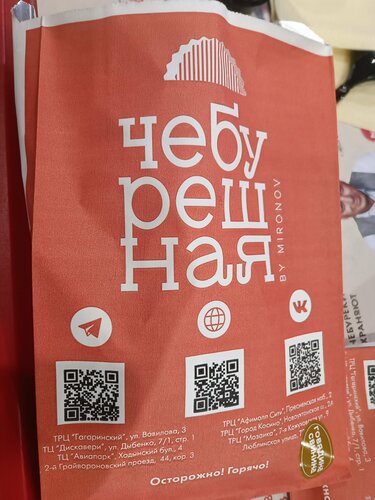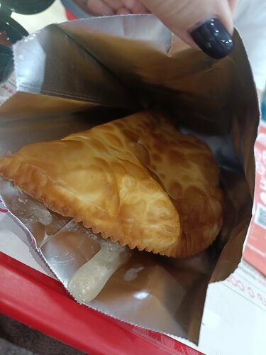 Пробовали чебуреки говядина-свинина дополнительно к ним соус гриль, морс смородина и квас. Чебуреки вкусные,сочные, горячие. Тесто вмеру хрустящее. Удобная упаковка,такая термо защищающая ваши руки от "ау, горячо".Морс вкусняшка, квас по мне кисловат. Открыла для себя макать чебурек в соус-это очень вкусно...но тут слово макать не подходит,скорее накладывать ложкой на чебурек. Соусник 25гр оооочень маленький( это не удобно. Персонал вежливый, заинтересованный в продаже. Сама чебурешная расположена на территории платформы Москва на волне. Столы чистые, кресла приятные. Есть указатели "убрать за собой",но лишь одно место куда можно убрать в концеее довольно таки большого зала.