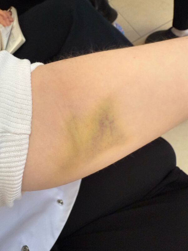 насчёт анализов претензий нет, пришли быстро. Персонал максимально вежливый и приветливый. Но такой огромный синяк после взятия крови из вены мне ставят первый раз за всю жизнь. После приема через минут 10 у меня очень сильно разболелась рука, было больно ее сгибать. Спустя 4 дня место выше инъекции до сих пор болит, а синяк не проходит