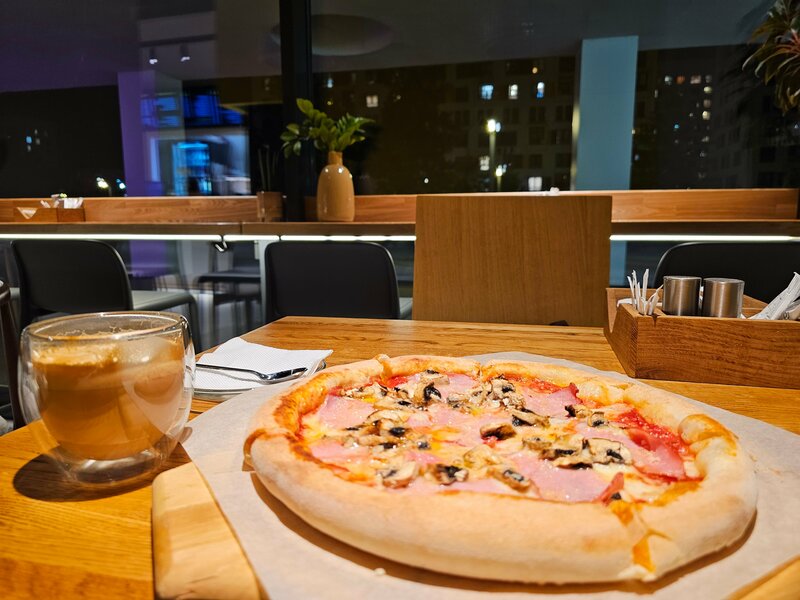 Вкусная пицца на тонком тесте. Начинка сочная и структурная. Порадовало, что пицца не была подгоревшой, или с ярко выраженном вкусом дешевого масла, как бывает в других пиццериях. Сотрудницы вежливые и обищтельные, кофе хороший