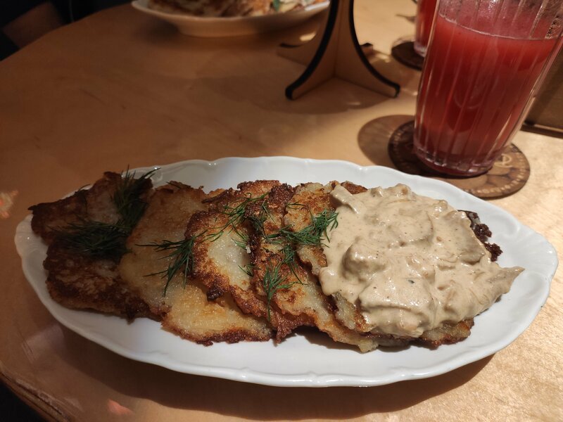Подача блюд не соответствует изображению на этом сайте. Фото драников с мочанкой прилагаю (и это как будто бы 400 грамм еды). Ожидание ~45 минут вместо обещанных 30. Сет с настойками подали сразу. На одной из рюмок остались следы помады других посетителей. После замечания официантка очень внимательно рассматривала, забрала рюмку и принесла другую со словами "я перелила" Класс!