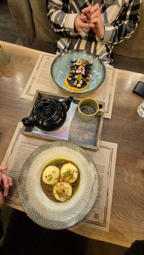 Upd редактирую отзыв после недавнего похода в ресторан. Я в восторге! Музыка локальная в современных аранжировках, обновилось меню и его оформление, добавились интересные подачи. Стейк, щечки, десерты картошку и ржаное мороженое очень рекомендую! Место уютное, симпатичное. Брали клецки и колдуны. Хоть клецки были и из картофеля, но чувствовался какой-то порошок будто, не очень понравилось. Колдуны с тыквенным пюре понравились, интересный вкус, сочное блюдо. Музыка играла громко и какое-то техно тыц-тыц, не романтично, не удобно разговаривать. По просьбе сделали тише, стало лучше. Официанты вежливые, улыбчивые, давали рекомендации. Глинтвейн на красном вине вкусный, понравился.