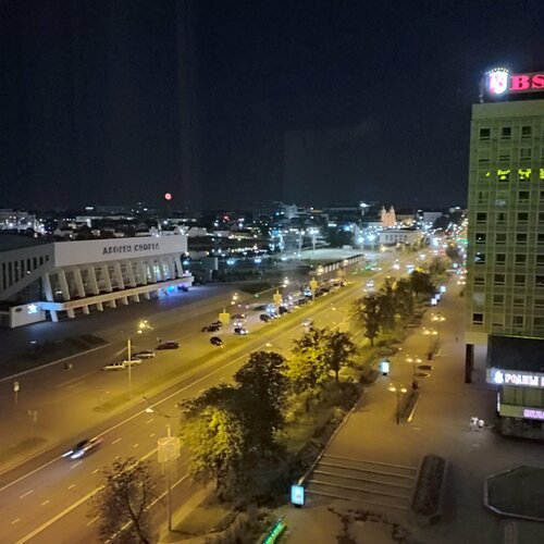 Проживали в гостинице в период с 13 июля 2025 по 18 июля 2025 на 10 этаже в номере с чудесным видом на город . Номер не большой, но уютный. В номере был холодильник, чашки, в ванной ежедневно пополнялись туалетные принадлежности. У гостиницы очень удачное месторасположение, тк всё в шаговой доступности. Прямо у входа автобусная остановка. Персонал вежливый, внимательный, доброжелательный. Пожалуй, это основные плюсы данной гостиницы. Номерной фонд старый и всё достаточно просто, скромно, без роскоши, номера маленькие, душевая кабина крошечная. В номере был телевизор, но мы его не включали. На этаже кулер с горячей и холодной водой. Не знаю как часто проверяют наличие воды, но было несколько раз, что встаешь утром и хочешь попить чай, а кулер пустой. Поэтому нужно иметь в номере бутылочку воды. Возможно, можно заказать из ресторана, но мы там не были. Хотя внизу при входе есть кафе и кофе можно приобрести и там. На этаже есть гладильная доска и утюг. Они курсируют по коридору от номера к номеру. В коридоре много розеток, что позволяет гладить рядом с местом проживания. Спасибо всему персоналу за качественную уборку, быстрое реагирование на любую просьбу. Если Вы не привередливы и любите красивые виды из окна, то Вам сюда. Наверное, в гостинице есть и более просторные номера, но мы всё время проводили в движении, поэтому остались очень довольны гостеприимным приёмом. На фото вид из окна номера на вечерний Минск.