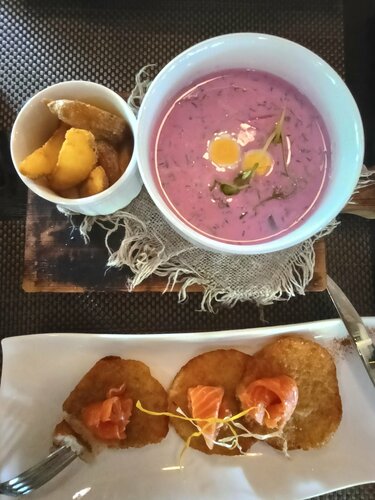 Заезжали на перекус. Все очень понравилось. Драники с лососем обалденные. Цены приемлемые. Очень красивый интерьер.