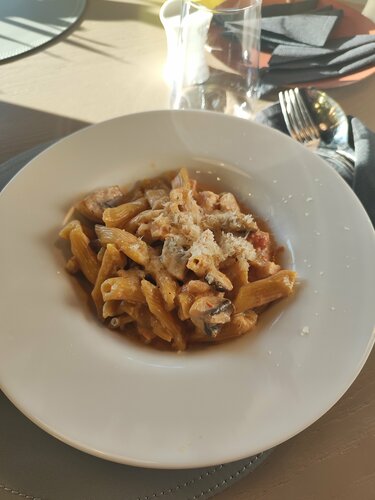 Хорошее место в туристической зоне. Были в субботу вечером, людей много, но места были. Атмосфера приятная, есть комфортные столики с панорамным видом. Обслуживание нормальное, из-за заполненности ресторана официанты немного в запаре, но видно, что стараются всех обслужить как полагается. Брали цитрусовый лимонад, довольно неплохой. Лазанья вкусная, мясная; паста с курицей и грибами очень вкусная, сливочная с густым соусом. Для разового помещения точно рекомендую, особенно если получится забронировать столик с панорамным видом.