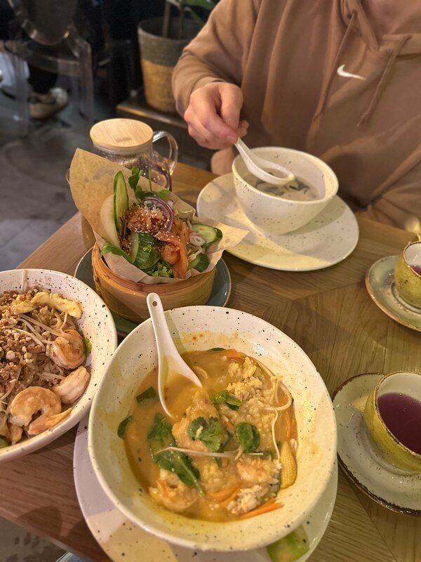 Невзрачное кафе, но я вдохновилась отзывами 1) суп сливочный с угрем вкусный, но он практически одинаковый в разных заведениях 2) курица и креветки с манго в кокосовом соусе. Блюдо интересное, но по вкусу сложное, тяжело было доедать. 3) бао с лососем ужасное. Сама паровая булочка как будто полежала, а начинка очень сухая. Только зелень с огурцами и лосось, никакого соуса. Лосось тоже не очень. 4) пад тай ни о чем. В нем должен быть многогранный вкус ( и сладость и острота и кислинка), но чувствуется только кислота. Креветки приготовлены отдельно и пресноваты. 5) дим самы с креветками и угрем. Вкусно, но они слиплись между собой и прилипли к листу, на котором лежали. 6) фиолетовый чай. Очень сладкий и очень кислый. Много лимона добавлено. На вкус как компот.