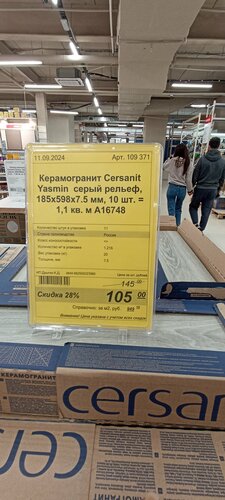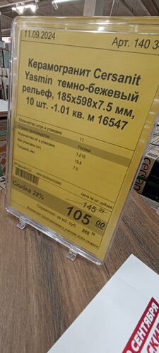 В данном магазине присмотрели керамогранит. В добавок к этому цена на ценнике показалась достаточно приятной. Скинула фото ценников. Обратите внимание, что крупными цифрами указана стоимость за 1 штуку изделия, а ниже написана цена за квадратный метр 949 рублей с примечанием "Справочно". Что это значит? Мне не понятно. Может означает " Приблизительно, ориентировочно"? Не знаю из каких расчётов она указана. При выборе плитки, как правило опираешься на стоимость за квадратный метр. На это число и смотрела, когда выбрала керамогранит. Но при выписки его на кассу, сотрудник магазина посчитал из расчёта за 1 штуку. И вышло, что квадратный метр получился 1050 рублей, вместо указанного на ценнике 949 рублей. А в рамках объёма это уже существенная разница! Зачем тогда писать стоимость за одну и за квадратный метр. Не понимаю! Товар приобрели, но неприятный осадок остался!