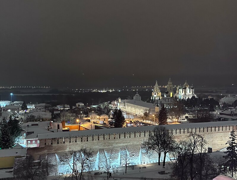 Я поднималась на колокольню вечером 7 января, когда город был в праздничной подсветке и весь запорошен снегом. Мы провели в Коломне целый день, поели в ресторане, а потом решили перед отъездом в Москву ещё пройтись по вечернему городу. Проходя мимо колокольни, увидели, что смотровая площадке работает до 20.00. Я очень люблю всяческого рода вылазки на смотровые площадки, поэтому не смогла себе отказать в удовольствии, хотя муж сказал, что не полезет:)) Оплатила на входе 200 р. по карте и смело шагнула в темноту лестницы. Ступени были со снежной наледью, освещения - ноль, потом пошла винтовая лестница с деревянными ступенями и такой же наледью....Я спортивная дама и достаточно ловкая, поэтому восприняла все эти мелочи, как небольшое недоразумение. Тем более они искупались отличными видами вечернего города. Но, спустившись вниз, я сказала служительнице, что они сильно рискуют, пуская людей в темноте по обледенелым ступеням на такой непростой подъём. Предупреждать однозначно нужно, что лестница очень крутая, освещения нет и нужно рассчитывать свои силы. Технику безопасности никто не отменял!!