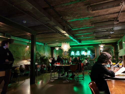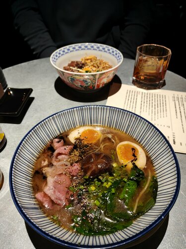 Перед походом вычитал много отзывов и хороших и не очень об этом месте. Было принято решение сформировать собственное впечатление Атмосфера внутри отличная, неон, приглушённый свет, зеркала и старые интерьеры, выглядит классно. Обслуживание тоже хорошее Снял звезду за то, что за весомый ценник качество блюд действительно посредственное, часть из них как и было сказано в других обзорах обильно заливают соевым соусом. По состоянию того же риса — от блюда к блюду, как попадет, в одних он был слипшийся разваренный, в других хороший Неприятнее всего оказались маленькие круглые столы, даже для двух персон места на таком остаётся очень мало, всё впритык