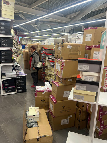Персонала нет , коробки с обувью стоят на проходе просто наваленные , понравилась пара обуви , не было размеров на витрине, зашли в интернет-магазин посмотреть где есть в наличии, показала что они есть в магазине, подошли на кассу сказали где-то там в коробках валяются и вместо того чтобы посмотреть попробовать найти их просто плюнули и горят идите в другие магазины но и там нет гарантии что стоят на полках , смеются и говорят а нам что сделать и всё в таком роде, на фотографии коробки в которых вроде как и должна быть та самая пара обуви и судя по словам нам самим предлагают в них рыться , вам надо вы и ищите, самое интересное так же в интернет-магазине можно заказать их на магазин , и вот интересно как они бы отвертелись если так сделали бы , у меня просто не было на это времени, но очень разочарована магазином , очень хотела эту пару обуви