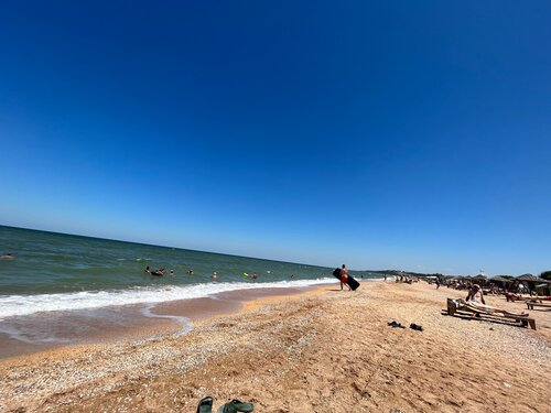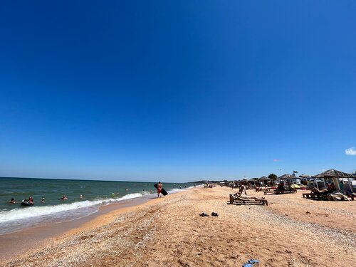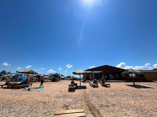 Имеется общий душ холодный; горячий платный, имеются раковины для умывания, чистый пляж ракушечник, шезлонги, зонты, детский кинотеатр, магазин, туалеты уличные либо в здании кафе, правда очередь там всегда есть ) также имеются общие холодильники. В общем все удобства есть, рекомендую запастись пауэр бэнком в поездку, также тентом, чтобы сидеть в тенёчке, и спреем от комаров вечером.
