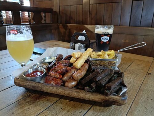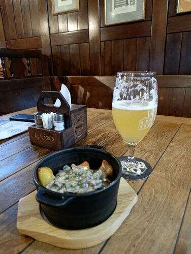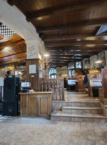 Теперь это наше тайное место в Минске, обязательное к посещению. Как говорится, пришел - попробовал - полюбил... В этом ресторане каким-то особым образом соблюден баланс: интерьер - кухня - обслуживание. Очень атмосферно и уютно. Интерьер выдержан в стиле, характерном для дореволюционных пивных заведений. Отделка панелей и потолка из дерева создает ощущение комфорта, надежности и уюта. Добротная деревянная мебель. Грамотное зонирование на разных уровнях. Мягкое освещение, достаточное количество света за счет больших окон. Интересное оформление стен со множеством забавных надписей, но без перебора. Если вам повезет зайти в этот ресторан, когда посетителей немного, то можно с удовольствием рассмотреть детали интерьера и насладиться тихой атмосферой. При полной загруженности заведения тут, конечно, шумновато. Кухня хороша без преувеличения. Меню не слишком большое, но разнообразное, с традиционным белорусским колоритом. Любителям сытной еды и хорошего пива есть чем себя порадовать. Цены адекватные. Персонал приветливый, без лишней суетливости и навязчивости. Официаны хорошо ориентируются в меню и технологии приготовления блюд. Про пиво вам тоже все расскажут и посоветуют лучшее. За время отпуска посетили ресторан несколько раз. Впечатление осталось очень благопрятное. Вернемся сюда непременно, ведь запеченую рульку еще не попробовали.