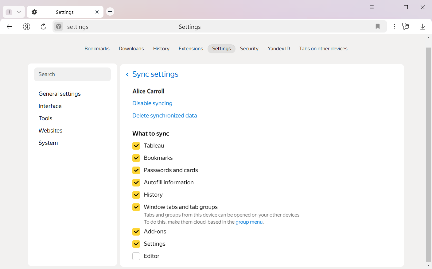 By default, Yandex Browser syncs your Tableau, bookmarks, passwords, bank cards, autofill data, history, tabs and tab groups (if you enabled cloud storage in the groups menu), extensions, and settings.