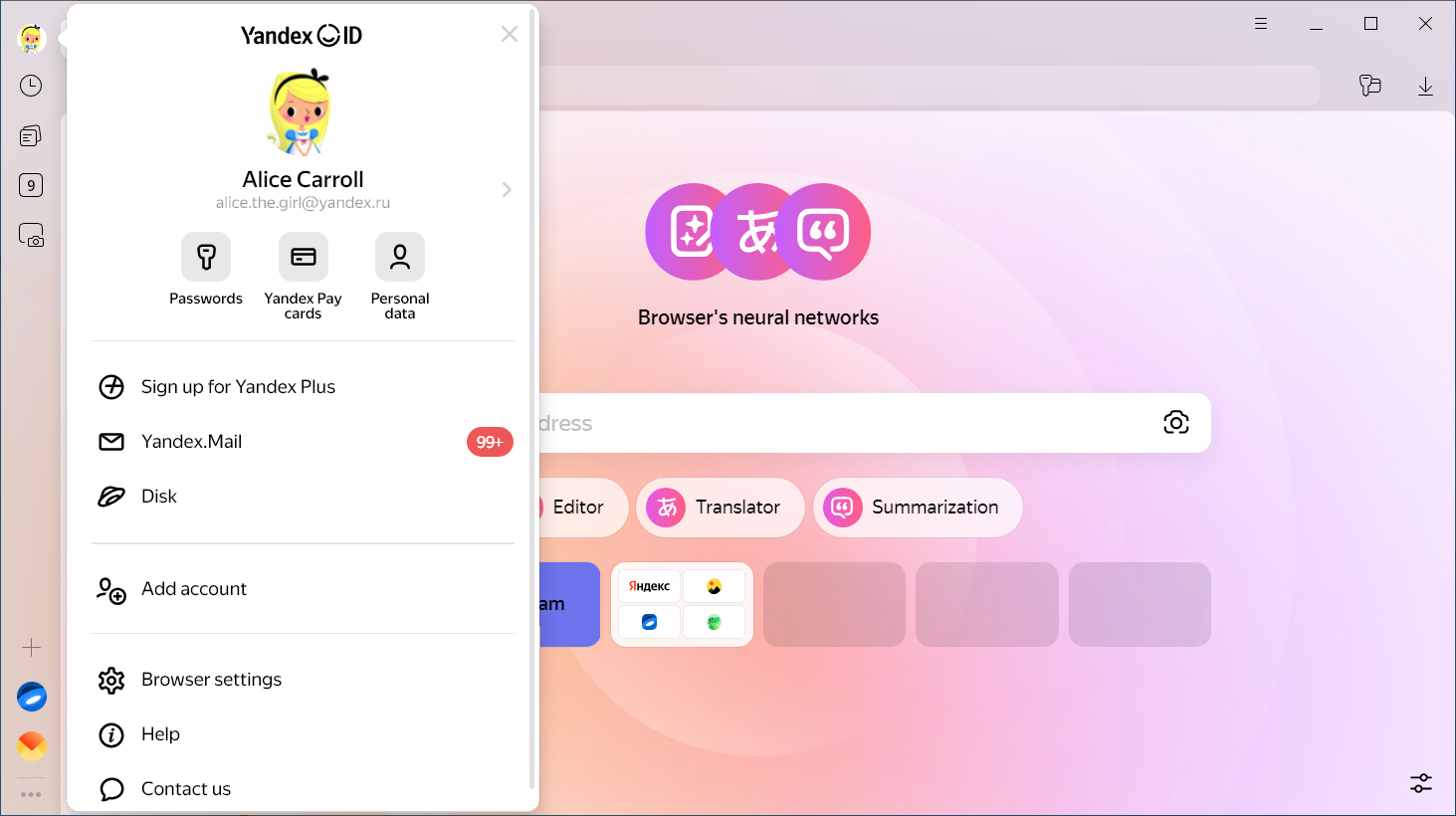 Logging in gives you quick access to your personal data (such as passwords and cards), Yandex services, and frequently used Yandex Browser features.