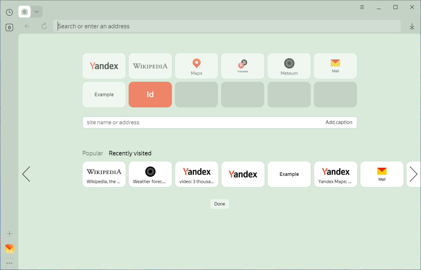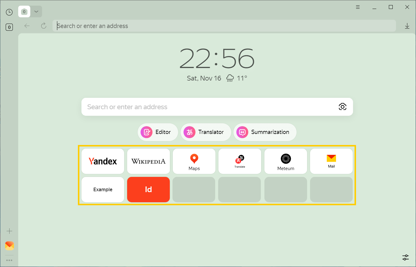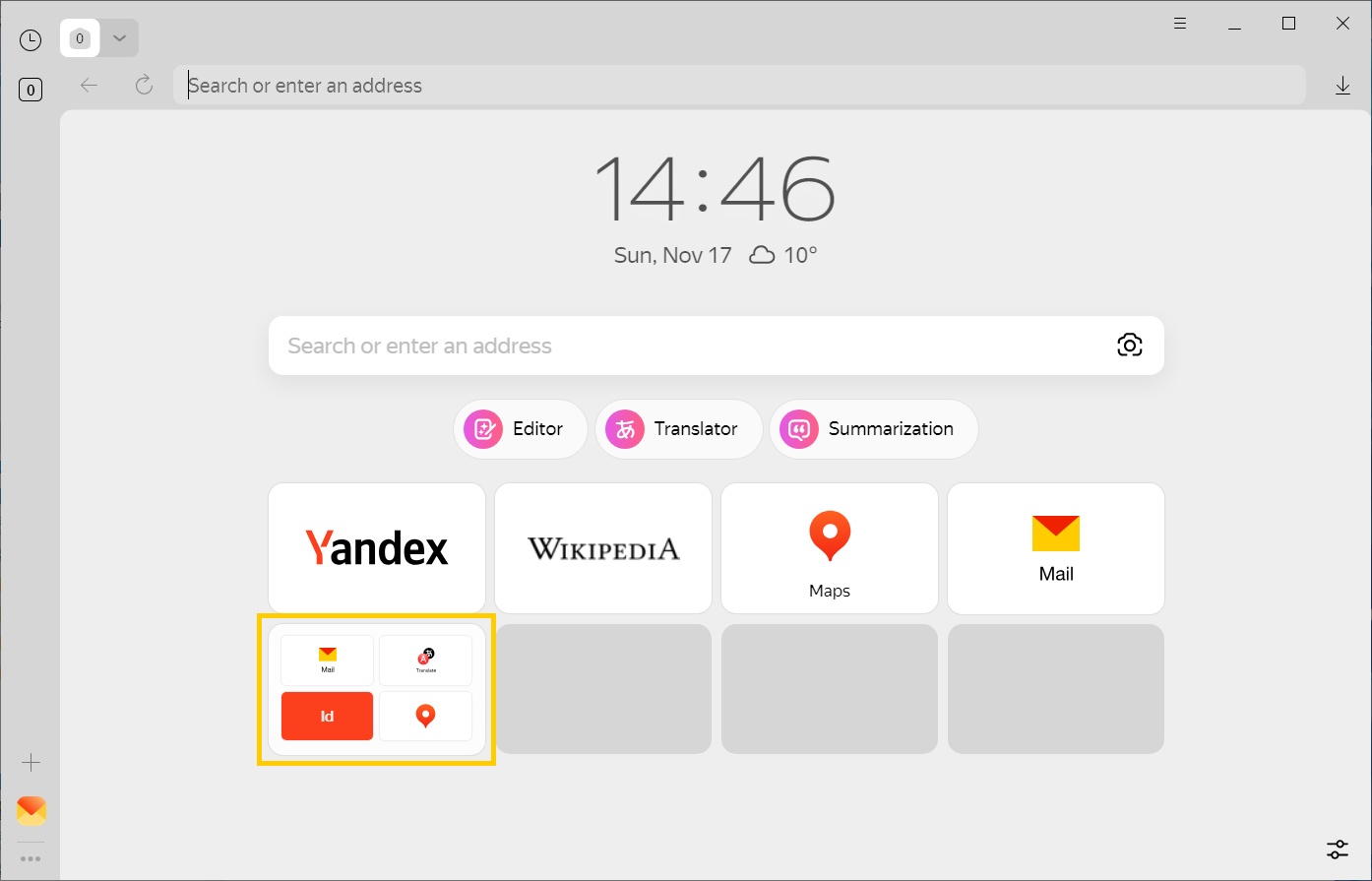 You can group tiles into folders. For example, tiles that link to Yandex services are grouped into a single folder by default.