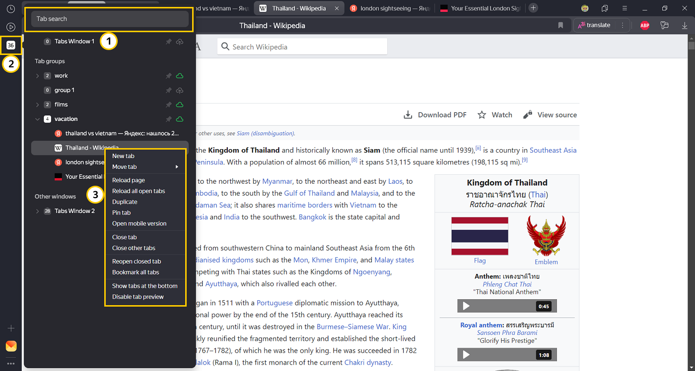 When a lot of tabs are open, they may become difficult to navigate.The Yandex Browser beta version contains a special panel for managing a large number of tabs. The panel displays tabs in a vertical list that's divided into groups.