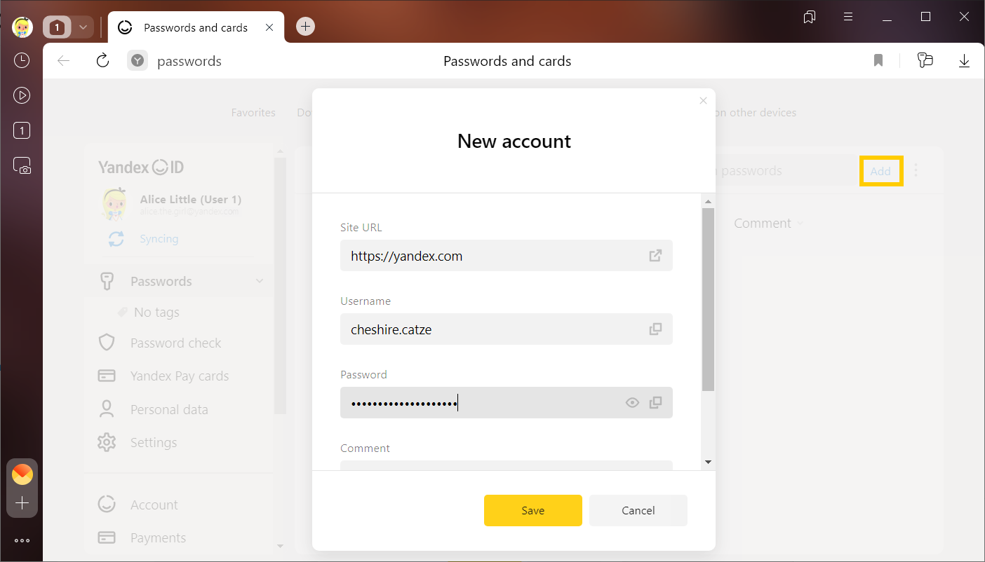 Similarly, you can save in the password manager your passport number and other confidential information. If bank card saving is enabled, the data will be available on all your devices. You don't have to worry about the security of your data because it is stored in encrypted format.