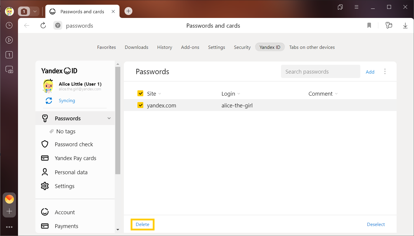 If you deleted a password by mistake, you can restore it immediately. In the lower-left corner of the password manager, click Restore. If you reload the page or switch to a different tab, you won't be able to restore the password.